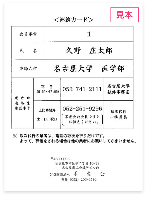 「献体登録大学名」「死亡時連絡先電話番号」をご家族・ご親族など近しい方にお伝えください。
