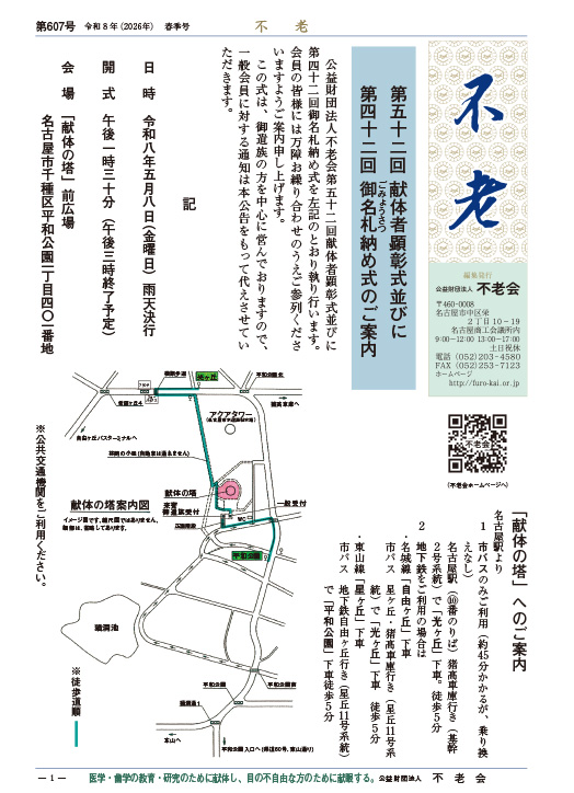 不老会は、愛知県および岐阜県美濃地方で、献体・献眼を通して医療の進歩に貢献してきたボランティア組織です。愛知県内の5つの大学やアイバンクと連携・協働しており、公益財団法人として活動しています。